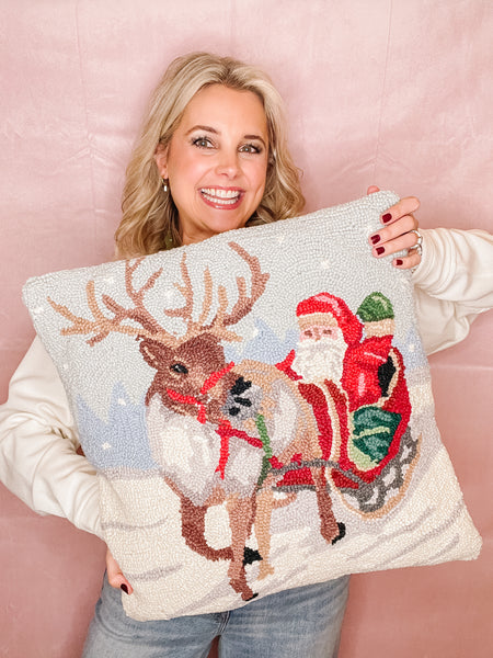 A classic Santa pillow with Santa and his reindeer! A 18x18 throw pillow, 100% wool hooked square pillow with 100% poly velvet backing. Includes polyester insert, zipper closure.