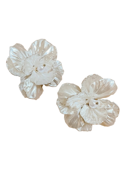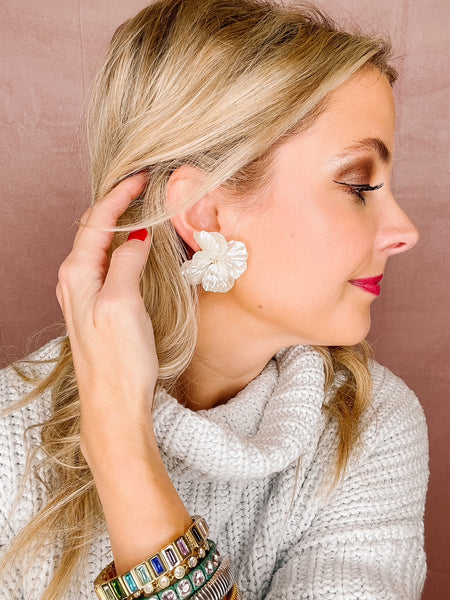 Darling pearl petal shaped clusters create this floral statement. Perfect year round but stunning for the winter season. Lightweight, surgical grade stainless steel, and made for everyday wear.