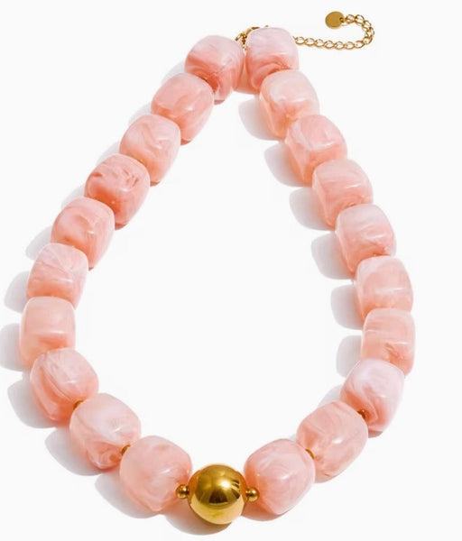 Loving the chunky necklace trend and this one is a winner! Pink hued Acrylic Rounded Square Beads make up the Martha necklace. Length is 16.5" with a toggle closure. Match with the Pink Martha Bracelet