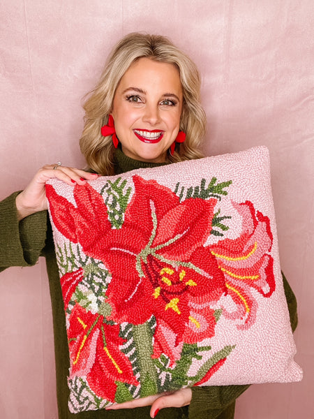The gorgeous companion to the Poinsettia Pillow! Soft pinks and reds with gorgeous amaryllis blooms create this 16x16 100% wool hooked square pillow with 100% poly velvet backing. Rosy Pink Background
