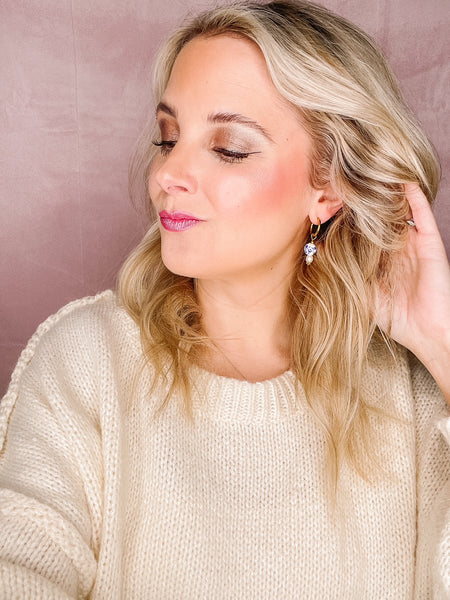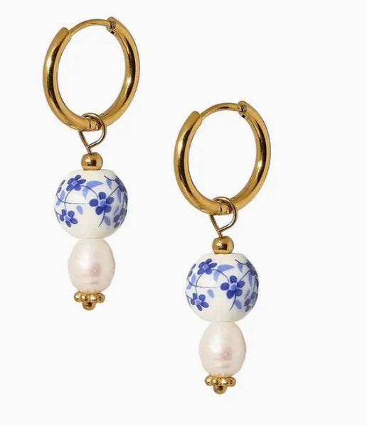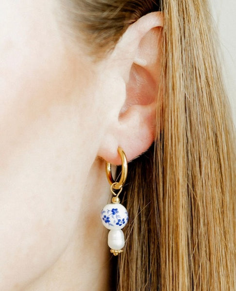 Features: * 15mm gold-plated huggie hoops * 20mm x 10mm removable charm * Hand-painted porcelain bead and freshwater pearl design * Lightweight and comfortable for all-day wear * Hypoallergenic and nickel-free materials * Designed in Dallas, Texas