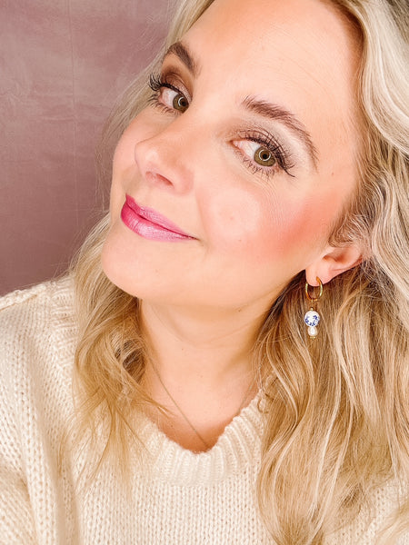 Classic and feminine, the Beverly Huggie Charm Earrings feature hand-painted blue-and-white porcelain beads paired with freshwater pearls for a timeless, polished look. Crafted with gold-plated 15mm huggie hoops and removable 20mm x 10mm charms, these earrings transition effortlessly from day to night.