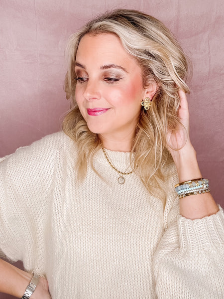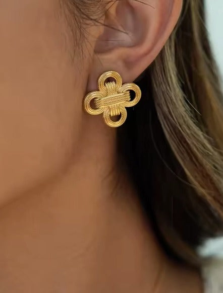 Chic, everyday rope-textured clover studs with a bold, sculpted twist for a standout golden shine. Water-resistant and stainless steel. Tarnish Resistant