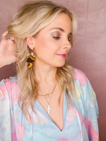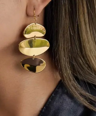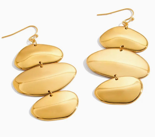 These golden Creek Pebble Drop Earrings make a stunning statement with their smooth pebble inspired shapes and glossy gold shine. Lightweight and eye catching, perfect for dinner dates, events or adding something special to everyday outfits. Stainless steel, waterproof, and tarnish resistant. Approx 3" long