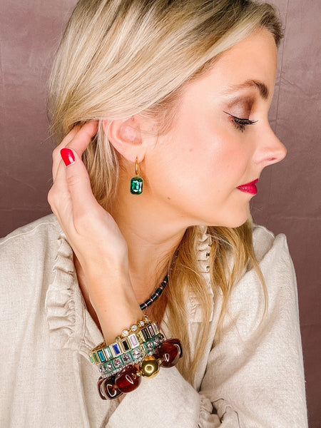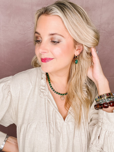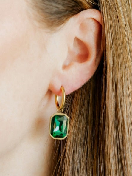 Features: * 16mm gold-tone hoop with removable charm * 15mm x 11mm emerald-green gemstone charm * Lightweight, hypoallergenic, and nickel-free * Safe for sensitive ears and designed for versatile wear