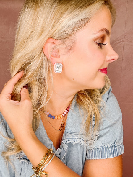 Meet Eva—a modern, geometric stud that brings big sparkle with a clean, color-pop edge. A faceted clear CZ sits inside an octagonal, glossy bezel for a fresh, minimalist-meets-statement look. At 22mm long x 17mm wide, Eva is lightweight yet eye-catching, finished with surgical-grade stainless-steel posts that are hypoallergenic, nickel- and copper-free—perfect for sensitive ears and everyday wear.
