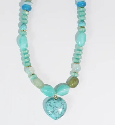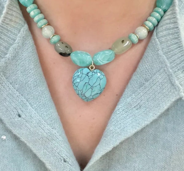Wear your heart on your sleeve—or better yet, around your neck! This charming turquoise gemstone pendant captures the essence of carefree elegance with its soothing mint hues. Suspended from a delicate beaded chain, this 17-inch (with a a 3' extender) beauty sits perfectly at your collarbone, making it ideal for layering or wearing solo. Whether you're channeling boho vibes or adding a pop of color to your everyday look, this gemstone treasure brings a touch of whimsy and natural beauty to any outfit.