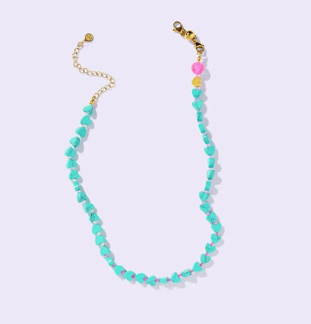 Add a splash of fun to your look with the Janey Necklace. Featuring charming turquoise heart beads paired with delicate pink glass seed beads, this playful necklace brings a pop of color to your outfit. The magnetic clasp and extender chain make it easy to wear and adjust for the perfect fit. Embrace the fun vibes with this vibrant and versatile accessory!