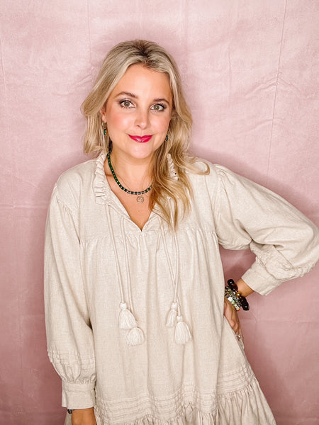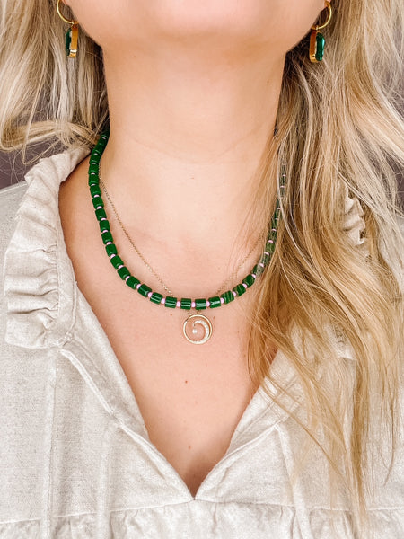 Add a pop of playful charm to your fall looks with the Maddie Necklace. Featuring rich dark green beads paired with delicate pink seed beads, this layered piece brightens any outfit. The magnetic clasp and extender chain make it easy to wear at your perfect length, ideal for mixing and matching your favorite accessories. Embrace the season with a necklace designed to turn heads and spark compliments. Pair one with a pair of earrings for a sweet + thoughtful gift! Perfect for brightening someone’s day or treating yourself to a cheerful accessory.