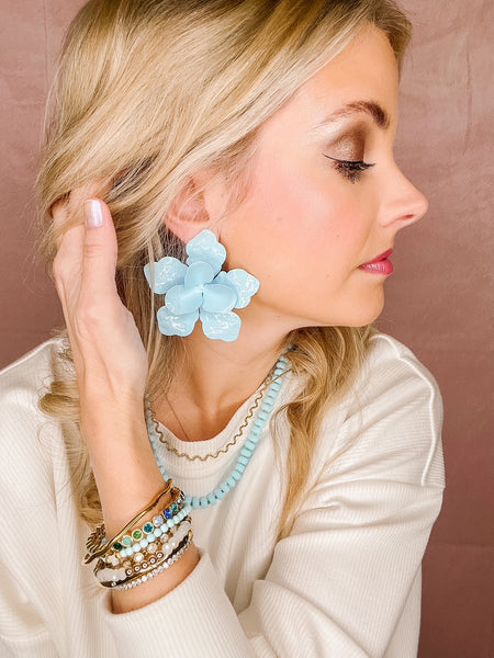 The Maxine Earrings in blue make a bold yet refined statement with sculptural floral petals finished in a rich, glossy blue hue. Accented with gold-toned edges, this design blends modern artistry with timeless elegance. Lightweight with dimensional impact, Maxine is made to stand out without feeling heavy.