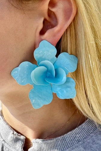 Features * Floral stud earring design * Sculptural, layered petal detailing * Glossy blue finish with gold-tone accents * Classic post-back closure * Lightweight statement style * Hypoallergenic * Lead, copper, and nickel free