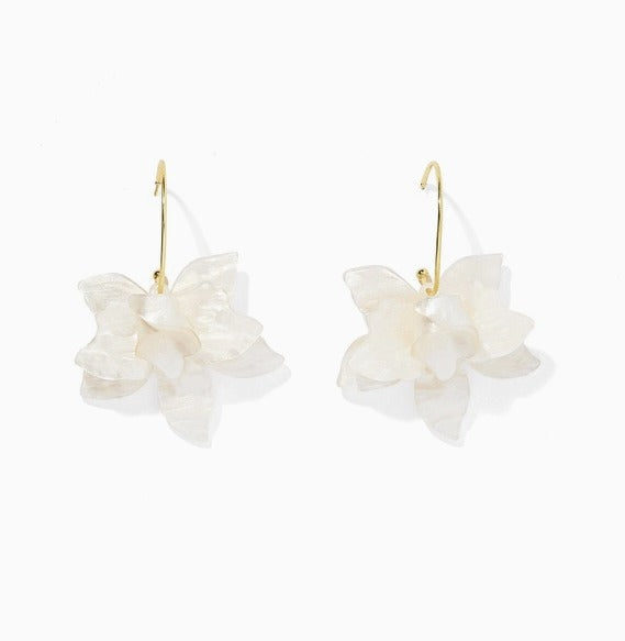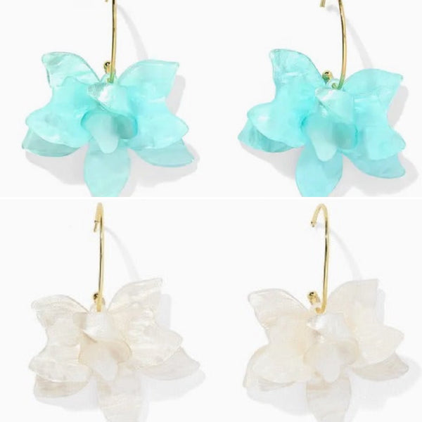 Features * Layered floral drop earring design * Translucent aqua petals or white petals * Gold-tone hook-back closure * Lightweight with soft movement * Comfortable for all-day wear * Hypoallergenic * Lead, copper, and nickel free