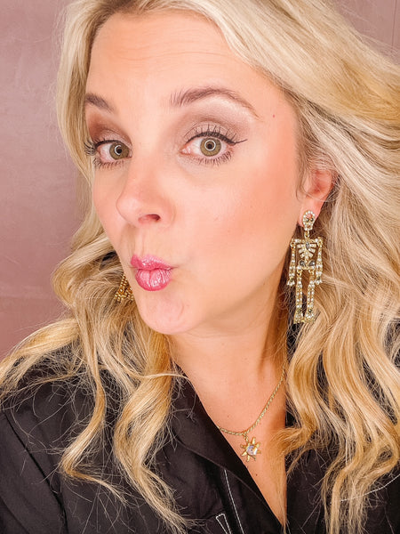 The Skeleton Statement Earrings feature a 3-inch long design with sparkling CZ details, creating a bold and fun look. Perfect for Halloween, these earrings add a spooky touch to your costume or outfit. Lightweight and comfortable, they are sure to make a statement at any festive occasion.