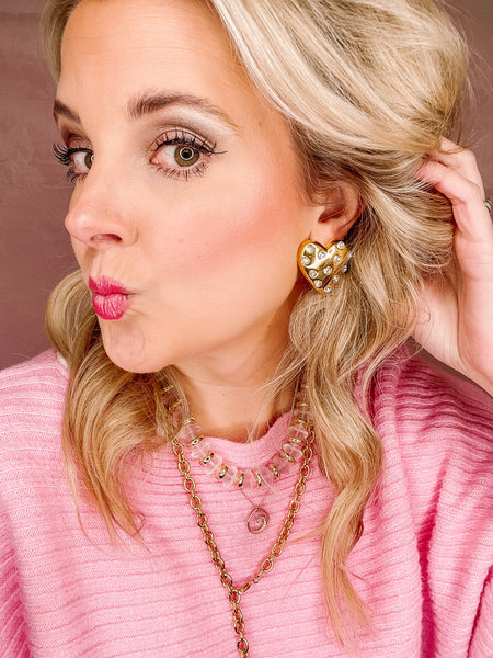 Gorgeous, fun, oversized and made for February 14th, these Sparkle Hearts are water resistant, 18k gold plated, and hypoallergenic. A super fun oversized stud to literally wear with anything!